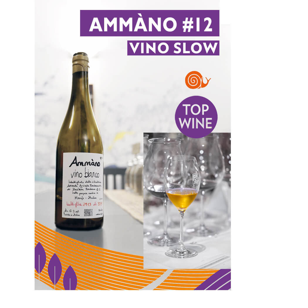 Insieme alla Chiocciola, festeggiamo anche Ammàno #12, segnalato come Vino Slow e Top Wine 2026: materico, croccante, con un’anima citrino-salata e una beva appagante.